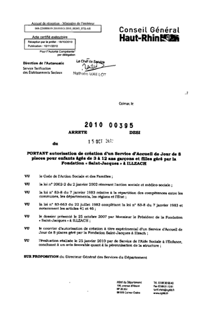 portant autorisation de création d'un service d'accueil de jour de 8 places pour enfants âgés de 3 à 12 ans et filles géré par la fondation "Saint-Jacques" à ILLZACH. Resumé Pièces jointes ARRETE Assemblée : Non défini Date : 15/10/2010 Rapporteur : Non défini Collectivité : Conseil départemental du Haut-Rhin Direction : Non défini Service : Direction de l'Autonomie Domaine : Accueil d'enfants Commission :