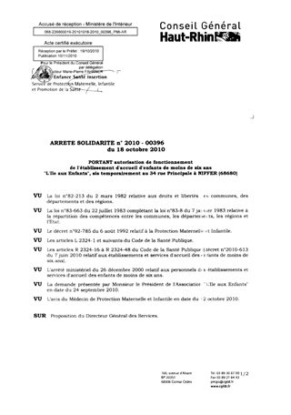 portant autorisation de fonctionnement de l'établissement d'accueil d'enfants de moins de six ans "L'Ile aux Enfants", sis temporairement au 34 rue Principale à NIFFER (68680). Resumé Pièces jointes ARRETE Assemblée : Non défini Date : 18/10/2010 Rapporteur : Non défini Collectivité : Conseil départemental du Haut-Rhin Direction : Non défini Service : Direction Enfance Santé Insertion Domaine : Accueil d'enfants Commission :