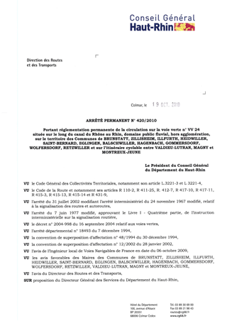 portant réglementation permanente de la circulation sur la voie verte n° VV24 située sur le long du canal du Rhône au Rhin, domaine public fluvial, hors agglomération, sur le territoire des communes de BRUNSTATT, ZILLISHEIM, ILLFURTH, HEIDWILLER, ST BERNA