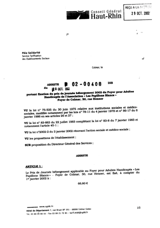 Portant fixation du prix de journée hébergement 2002 du foyer adultes handicapés de l'association "Les Papillons Blancs" Foyer de Colmar 30, rue Henner. Resumé Pièces jointes ARRETE Assemblée : Non défini Date : 28/10/2002 Rapporteur : Non défini Collectivité : Conseil départemental du Haut-Rhin Direction : Non défini Service : Direction de la Solidarité Domaine : Prix de Journée Commission :