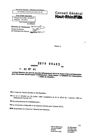 portant fixation du prix de journée hébergement 2010 du foyer d'accueil spécialisé pour personnes handicapées vieillissantes "Saint André" à CERNAY de l'association "Adèle de Glaubitz". Resumé Pièces jointes ARRETE Assemblée : Non défini Date : 22/10/2010 Rapporteur : Non défini Collectivité : Conseil départemental du Haut-Rhin Direction : Non défini Service : Direction de l'Autonomie Domaine : Prix de Journée Commission :