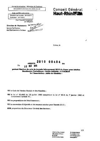 portant fixation du prix de journée hébergement 2010 du foyer pour adultes handicapés travailleurs "Relais Adélaïde" à COLMAR de l'association "Adèle de Glaubitz". Resumé Pièces jointes ARRETE Assemblée : Non défini Date : 22/10/2010 Rapporteur : Non défini Collectivité : Conseil départemental du Haut-Rhin Direction : Non défini Service : Direction de l'Autonomie Domaine : Prix de Journée Commission :