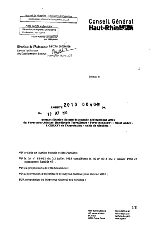 portant fixation du prix de journée hébergement et dépendance 2010 du foyer pour adultes handicapés travailleurs "Foyer Kennedy" "Saint André" à CERNAY de l'association "Adèle de Glaubitz". Resumé Pièces jointes ARRETE Assemblée : Non défini Date : 22/10/2010 Rapporteur : Non défini Collectivité : Conseil départemental du Haut-Rhin Direction : Non défini Service : Direction de l'Autonomie Domaine : Prix de Journée Commission :