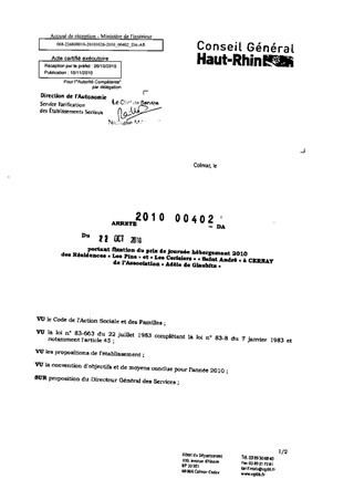 portant fixation du prix de journée hébergement 2010 des Résidences "Les Pins" et "Les Cerisiers" "Saint André" à CERNAY de l'association "Adèle de Glaubitz". Resumé Pièces jointes ARRETE Assemblée : Non défini Date : 22/10/2010 Rapporteur : Non défini Collectivité : Conseil départemental du Haut-Rhin Direction : Non défini Service : Direction de l'Autonomie Domaine : Prix de Journée Commission :