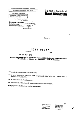 portant fixation du prix de journée hébergement 2010 du foyer d'accueil spécialisé "Saint André" à CERNAY de l'Association "Adèle de Glaubitz". Resumé Pièces jointes ARRETE Assemblée : Non défini Date : 22/10/2010 Rapporteur : Non défini Collectivité : Conseil départemental du Haut-Rhin Direction : Non défini Service : Direction de l'Autonomie Domaine : Prix de Journée Commission :