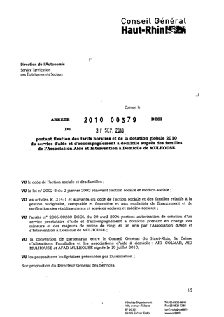 portant fixation des tarifs horaires et de la dotation globale 2010 du service d'aide et d'accompagnement à domicile auprès des familles de l'association Aide et Intervention à Domicile de MULHOUSE. Resumé Pièces jointes ARRETE Assemblée : Non défini Date : 30/10/2010 Rapporteur : Non défini Collectivité : Conseil départemental du Haut-Rhin Direction : Non défini Service : Direction de l'Autonomie Domaine : Prix de Journée Commission :