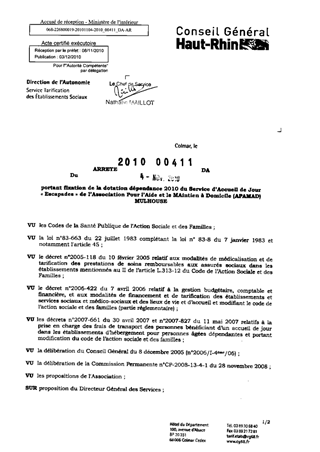 portant fixation de la dotation dépendance 2010 du service d'accueil de jour "Escapades" de l'association pour l'aide et le maintien à domicile (APAMAD) MULHOUSE. Resumé Pièces jointes ARRETE Assemblée : Non défini Date : 04/11/2010 Rapporteur : Non défini Collectivité : Conseil départemental du Haut-Rhin Direction : Non défini Service : Direction de l'Autonomie Domaine : Dotations financières Commission :