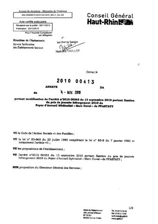 portant modification de l'arrêté n° 2010-00363 du 13.09.2010 portant fixation du prix de journée hébergement 2010 du foyer d'accueil médicalisé "Marc Duval" de PFASTATT. Resumé Pièces jointes ARRETE Assemblée : Non défini Date : 04/11/2010 Rapporteur : Non défini Collectivité : Conseil départemental du Haut-Rhin Direction : Non défini Service : Direction de l'Autonomie Domaine : Prix de Journée Commission :