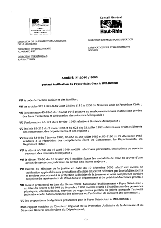 portant tarification du foyer Saint-Jean à MULHOUSE. Resumé Pièces jointes ARRETE Assemblée : Non défini Date : 23/11/2010 Rapporteur : Non défini Collectivité : Conseil départemental du Haut-Rhin Direction : Non défini Service : Direction Enfance Santé Insertion Domaine : Autres (non classés) Commission :
