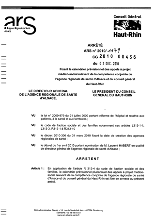 fixant le calendrier prévisionnel des appels à projet médico-social relevant de la compétence conjointe de l'agence régionale de santé d'Alsace et du Conseil Général du Haut-Rhin. Resumé Pièces jointes ARRETE Assemblée : Non défini Date : 02/12/2010 Rapporteur : Non défini Collectivité : Conseil départemental du Haut-Rhin Direction : Non défini Service : Direction de l'Autonomie Domaine : Autres (non classés) Commission :