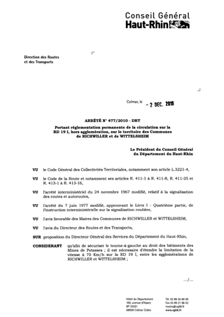 portant réglementation permanente de la circulation sur RD 19 I, hors agglomération, sur le territoire des communes de RICHWILLER et de WITTELSHEIM. Resumé Pièces jointes ARRETE Assemblée : Non défini Date : 02/12/2010 Rapporteur : Non défini Collectivité : Conseil départemental du Haut-Rhin Direction : Non défini Service : Direction des Routes Domaine : Circulation Commission :