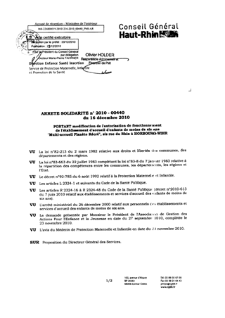 portant modification de l'autorisation de fonctionnement de l'établissement d'accueil d'enfants de moins de six ans "Multi-accueil Planète Récré", sis rue du Rhin à HORBOURG-WIHR. Resumé Pièces jointes ARRETE Assemblée : Non défini Date : 16/12/2010 Rapporteur : Non défini Collectivité : Conseil départemental du Haut-Rhin Direction : Non défini Service : Direction Enfance Santé Insertion Domaine : Accueil d'enfants Commission :