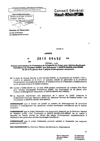portant autorisation de l'extension de la capacité du foyer pour adultes handicapés travailleurs de l'Institut (FAHT) "Les Tournesols" à STE-MARIE-AUX-MINES de 26 à 33 places dont 2 places d'hébergement temporaire. Resumé Pièces jointes ARRETE Assemblée : Non défini Date : 23/12/2010 Rapporteur : Non défini Collectivité : Conseil départemental du Haut-Rhin Direction : Non défini Service : Direction de l'Autonomie Domaine : Autres (non classés) Commission :