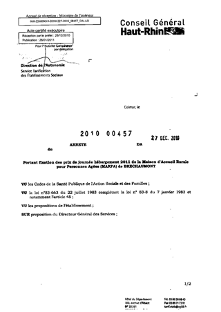 portant fixation des prix de journée hébergement 2011 de la Maison d'Accueil Rurale pour personnes âgées (MARPA) de BRECHAUMONT. Resumé Pièces jointes ARRETE Assemblée : Non défini Date : 27/12/2010 Rapporteur : Non défini Collectivité : Conseil départemental du Haut-Rhin Direction : Non défini Service : Direction de l'Autonomie Domaine : Prix de Journée Commission :