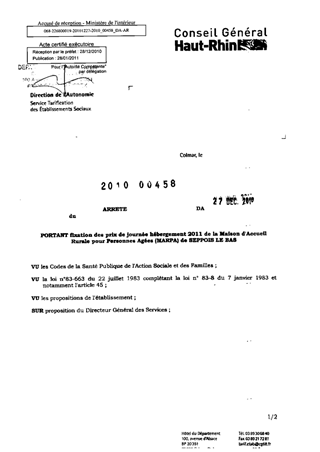 portant fixation des prix de journée hébergement 2011 de la maison d'accueil rurale pour personnes âgées (MARPA) de SEPPOIS LE BAS. Resumé Pièces jointes ARRETE Assemblée : Non défini Date : 27/12/2010 Rapporteur : Non défini Collectivité : Conseil départemental du Haut-Rhin Direction : Non défini Service : Direction de l'Autonomie Domaine : Prix de Journée Commission :