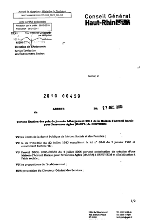 portant fixation des prix de journée hébergement 2011 de la maison d'accueil rurale pour personnes âgées (MARPA) de SENTHEIM. Resumé Pièces jointes ARRETE Assemblée : Non défini Date : 27/12/2010 Rapporteur : Non défini Collectivité : Conseil départemental du Haut-Rhin Direction : Non défini Service : Direction de l'Autonomie Domaine : Prix de Journée Commission :