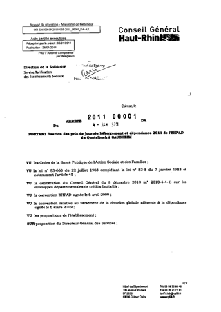 portant fixation des prix de journée hébergement et dépendance 2011 de l'EHPAD du Quatelbach à SAUSHEIM. Resumé Pièces jointes ARRETE Assemblée : Non défini Date : 04/01/2011 Rapporteur : Non défini Collectivité : Conseil départemental du Haut-Rhin Direction : Non défini Service : Direction de l'Autonomie Domaine : Prix de Journée Commission :