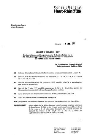 portant réglementation permanente de la circulation sur la RD 35 I, hors agglomération, sur le territoire des communes de THANN et de VIEUX-THANN. Resumé Pièces jointes ARRETE Assemblée : Non défini Date : 05/01/2011 Rapporteur : Non défini Collectivité : Conseil départemental du Haut-Rhin Direction : Non défini Service : Direction des Routes Domaine : Circulation Commission :