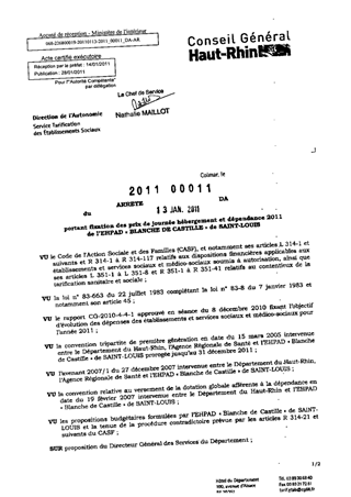 portant fixation des prix de journée hébergement et dépendance 2011 de l'EHPAD "Blanche de Castille" de SAINT-LOUIS. Resumé Pièces jointes ARRETE Assemblée : Non défini Date : 13/01/2011 Rapporteur : Non défini Collectivité : Conseil départemental du Haut-Rhin Direction : Non défini Service : Direction de l'Autonomie Domaine : Prix de Journée Commission :