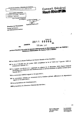 portant fixation des prix de journée hébergement et dépendance 2011 de l'EHPAD - Résidence Médicalisée du Canton Vert à ORBEY. Resumé Pièces jointes ARRETE Assemblée : Non défini Date : 13/01/2011 Rapporteur : Non défini Collectivité : Conseil départemental du Haut-Rhin Direction : Non défini Service : Direction de l'Autonomie Domaine : Prix de Journée Commission :