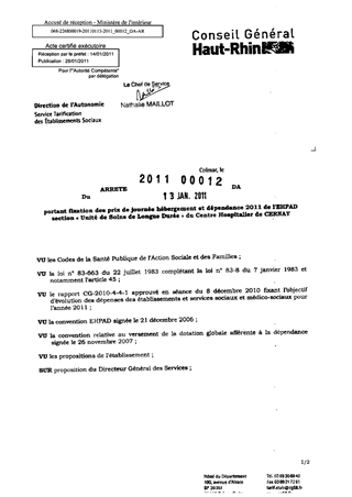 portant fixation des prix de journée hébergement et dépendance 2011 de l'EHPAD section "Unité de Soins de Longue Durée" du Centre Hospitalier de CERNAY. Resumé Pièces jointes ARRETE Assemblée : Non défini Date : 13/01/2011 Rapporteur : Non défini Collectivité : Conseil départemental du Haut-Rhin Direction : Non défini Service : Direction de l'Autonomie Domaine : Prix de Journée Commission :