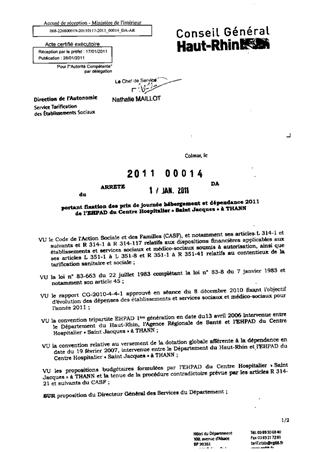 portant fixation des prix de journée hébergement et dépendance 2011 de l'EHPAD du centre hospitalier "Saint Jacques" à THANN. Resumé Pièces jointes ARRETE Assemblée : Non défini Date : 17/01/2011 Rapporteur : Non défini Collectivité : Conseil départemental du Haut-Rhin Direction : Non défini Service : Direction de l'Autonomie Domaine : Prix de Journée Commission :