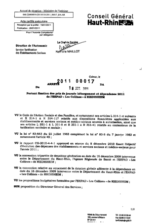 portant fixation des prix de journée hébergement et dépendance 2011 de l'EHPAD "Les Collines" à RIEDISHEIM. Resumé Pièces jointes ARRETE Assemblée : Non défini Date : 18/01/2011 Rapporteur : Non défini Collectivité : Conseil départemental du Haut-Rhin Direction : Non défini Service : Direction de l'Autonomie Domaine : Prix de Journée Commission :