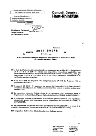 portant fixation des prix de journée hébergement et dépendance 2011 de l'EHPAD de SOULTZMATT. Resumé Pièces jointes ARRETE Assemblée : Non défini Date : 20/01/2011 Rapporteur : Non défini Collectivité : Conseil départemental du Haut-Rhin Direction : Non défini Service : Direction de l'Autonomie Domaine : Prix de Journée Commission :