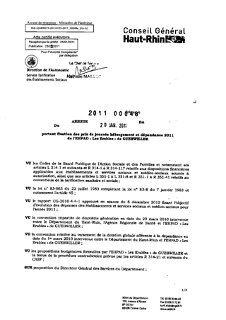portant fixation des prix de journée hébergement et dépendance 2011 de l'EHPAD "Les Erables" de GUEBWILLER. Resumé Pièces jointes ARRETE Assemblée : Non défini Date : 20/01/2011 Rapporteur : Non défini Collectivité : Conseil départemental du Haut-Rhin Direction : Non défini Service : Direction de l'Autonomie Domaine : Prix de Journée Commission :