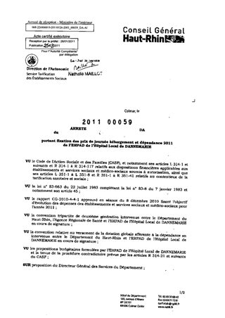 portant fixation des prix de journée hébergement et dépendance 2011 de l'EHPAD de l'hôpital local de DANNEMARIE. Resumé Pièces jointes ARRETE Assemblée : Non défini Date : 24/01/2011 Rapporteur : Non défini Collectivité : Conseil départemental du Haut-Rhin Direction : Non défini Service : Direction de l'Autonomie Domaine : Prix de Journée Commission :