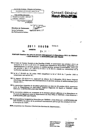 portant fixation des prix de journée hébergement et dépendance 2011 de l'EHPAD "Jules Scheurer" à BITSCHWILLER LES THANN. Resumé Pièces jointes ARRETE Assemblée : Non défini Date : 24/01/2011 Rapporteur : Non défini Collectivité : Conseil départemental du Haut-Rhin Direction : Non défini Service : Direction de l'Autonomie Domaine : Prix de Journée Commission :