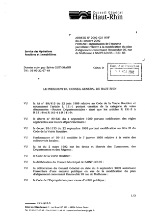 portant organisation de l'enquête parcellaire relative à la modification du plan d'alignement concernant l'immeuble 95, rue de Mulhouse à SAINT LOUIS - RD 66 Resumé Pièces jointes ARRETE Assemblée : Non défini Date : 31/10/2002 Rapporteur : Non défini Collectivité : Conseil départemental du Haut-Rhin Direction : Non défini Service : Service du Patrimoine et du droit des Sols Domaine : Déclassement de voirie Commission :