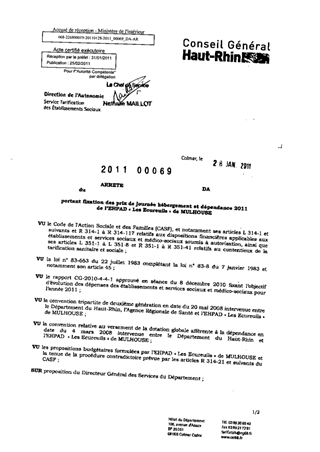 portant fixation des prix de journée hébergement et dépendance 2011 de l'EHPAD "Les Ecureuils" de MULHOUSE. Resumé Pièces jointes ARRETE Assemblée : Non défini Date : 28/01/2011 Rapporteur : Non défini Collectivité : Conseil départemental du Haut-Rhin Direction : Non défini Service : Direction de l'Autonomie Domaine : Prix de Journée Commission :