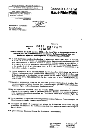 portant fixation des tarifs horaires 2011 du service d'aide et d'accompagnement à domicile pour les personnes adultes handicapées de l'association d'aide aux personnes âgées ou handicapées du Bassin Potassique (AAPAHBP). Resumé Pièces jointes ARRETE Assemblée : Non défini Date : 31/01/2011 Rapporteur : Non défini Collectivité : Conseil départemental du Haut-Rhin Direction : Non défini Service : Direction de l'Autonomie Domaine : Personnes Agées Commission :