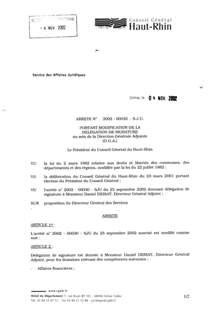 portant modification de la délégation de signature au sein de la Direction Générale Adjointe (D.G.A.) Resumé Pièces jointes ARRETE Assemblée : Non défini Date : 04/11/2002 Rapporteur : Non défini Collectivité : Conseil départemental du Haut-Rhin Direction : Non défini Service : Service Juridique Domaine : Organisation Interne Commission :