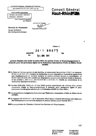 portant fixation des tarifs horaires 2011 du service d'aide et d'accompagnement à domicile pour les personnes âgées de la Fédération Association d'Aide en Milieu Rural (ADMR). Resumé Pièces jointes ARRETE Assemblée : Non défini Date : 31/01/2011 Rapporteur : Non défini Collectivité : Conseil départemental du Haut-Rhin Direction : Non défini Service : Direction de l'Autonomie Domaine : Autres (non classés) Commission :