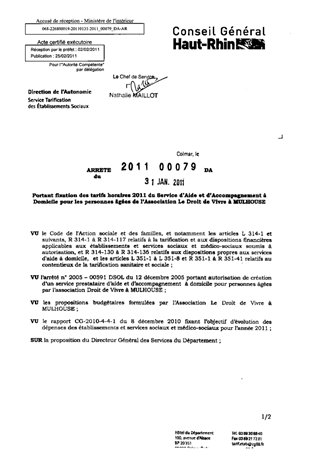 portant fixation des tarifs horaires 2011 du service d'aide et d'accompagnement à domicile pour les personnes âgées de l'association "Le Droit de Vivre" à MULHOUSE. Resumé Pièces jointes ARRETE Assemblée : Non défini Date : 31/01/2011 Rapporteur : Non défini Collectivité : Conseil départemental du Haut-Rhin Direction : Non défini Service : Direction de l'Autonomie Domaine : Personnes Agées Commission :