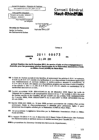portant fixation des tarifs horaires 2011 du service d'aide et d'accompagnement à domicile pour les personnes adultes handicapées de la Fédération Association d'Aide en Milieu Rural (ADMR) du Haut-Rhin. Resumé Pièces jointes ARRETE Assemblée : Non défini Date : 31/01/2011 Rapporteur : Non défini Collectivité : Conseil départemental du Haut-Rhin Direction : Non défini Service : Direction de l'Autonomie Domaine : Autres (non classés) Commission :