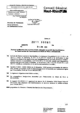 portant tarification des services d'aide ménagère au profit des bénéficiaires de l'aide sociale de l'association "Le Droit de Vivre" à MULHOUSE. Resumé Pièces jointes ARRETE Assemblée : Non défini Date : 31/01/2011 Rapporteur : Non défini Collectivité : Conseil départemental du Haut-Rhin Direction : Non défini Service : Direction de l'Autonomie Domaine : Autres (non classés) Commission :