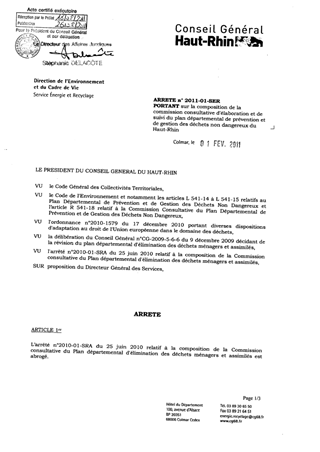 portant sur la composition de la commission consultatitve d'élaboration et de suivi du plan départemental de prévention et de gestion des déchets non dangereux du Haut-Rhin. Resumé Pièces jointes ARRETE Assemblée : Non défini Date : 01/02/2011 Rapporteur : Non défini Collectivité : Conseil départemental du Haut-Rhin Direction : Non défini Service : Direction de l'Environnement et du Cadre de Vie Domaine : Autres (non classés) Commission :