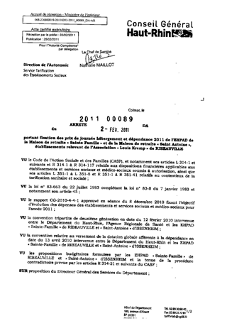 portant fixation des prix de journée hébergement et dépendance 2011 de l'EHPAD de la Maison de retraite "Sainte Famille" et de la Maison de retraite "Saint Antoine", établissements relevant de l'association "Louis Kremp" de RIBEAUVILLE. Resumé Pièces jointes ARRETE Assemblée : Non défini Date : 02/02/2011 Rapporteur : Non défini Collectivité : Conseil départemental du Haut-Rhin Direction : Non défini Service : Direction de l'Autonomie Domaine : Prix de Journée Commission :