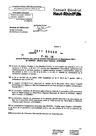 portant fixation des prix de journée hébergement et dépendance 2011 de l'EHPAD "Hôpital Saint Vincent" d'ODEREN. Resumé Pièces jointes ARRETE Assemblée : Non défini Date : 02/02/2011 Rapporteur : Non défini Collectivité : Conseil départemental du Haut-Rhin Direction : Non défini Service : Direction de l'Autonomie Domaine : Prix de Journée Commission :