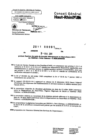 portant fixation des prix de journée hébergement et dépendance 2011 de l'EHPAD "Petit Château" à BEBLENHEIM. Resumé Pièces jointes ARRETE Assemblée : Non défini Date : 02/02/2011 Rapporteur : Non défini Collectivité : Conseil départemental du Haut-Rhin Direction : Non défini Service : Direction de l'Autonomie Domaine : Prix de Journée Commission :