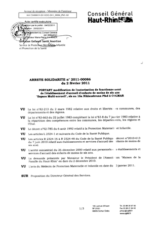 portant modification de l'autorisation de fonctionnement de l'établissement d'accueil d'enfants de moins de six ans "Espace Multi-accueil", sis au 16a Niklausbrunn Pfad à COLMAR. Resumé Pièces jointes ARRETE Assemblée : Non défini Date : 02/02/2011 Rapporteur : Non défini Collectivité : Conseil départemental du Haut-Rhin Direction : Non défini Service : Direction Enfance Santé Insertion Domaine : Accueil d'enfants Commission :