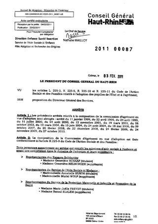 arrêté concernant la composition de la Commission d'Agrément en vue d'adoption. Resumé Pièces jointes ARRETE Assemblée : Non défini Date : 03/02/2011 Rapporteur : Non défini Collectivité : Conseil départemental du Haut-Rhin Direction : Non défini Service : Direction Enfance Santé Insertion Domaine : Autres (non classés) Commission :