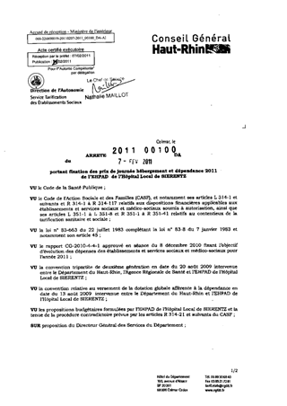 portant fixation des prix de journée hébergement et dépendance 2011 de l'EHPAD de l'Hôpital Local de SIERENTZ. Resumé Pièces jointes ARRETE Assemblée : Non défini Date : 07/02/2011 Rapporteur : Non défini Collectivité : Conseil départemental du Haut-Rhin Direction : Non défini Service : Direction de l'Autonomie Domaine : Prix de Journée Commission :