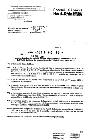 portant fixation des prix de journée hébergement et dépendance 2011 de l'EHPAD de l'unité de soins de longue durée de l'hôpital local de SOULTZ. Resumé Pièces jointes ARRETE Assemblée : Non défini Date : 10/02/2011 Rapporteur : Non défini Collectivité : Conseil départemental du Haut-Rhin Direction : Non défini Service : Direction de l'Autonomie Domaine : Prix de Journée Commission :
