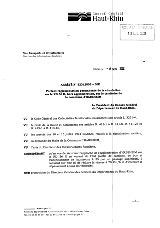 portant réglementation permanente de la circulation sur la RD 56 II, hors agglomération, sur le territoire de la commune d'HABSHEIM. Resumé Pièces jointes ARRETE Assemblée : Non défini Date : 06/11/2002 Rapporteur : Non défini Collectivité : Conseil départemental du Haut-Rhin Direction : Non défini Service : Direction des Routes Domaine : Circulation Commission :