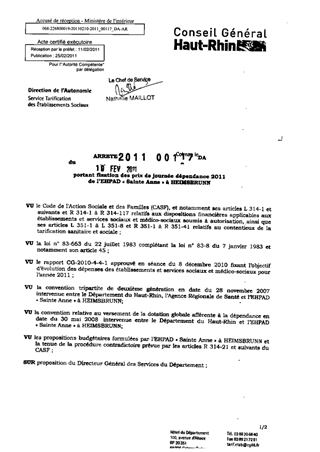 portant fixation des prix de journée dépendance 2011 de l'EHPAD "Sainte Anne" à HEIMSBRUNN. Resumé Pièces jointes ARRETE Assemblée : Non défini Date : 10/02/2011 Rapporteur : Non défini Collectivité : Conseil départemental du Haut-Rhin Direction : Non défini Service : Direction de l'Autonomie Domaine : Prix de Journée Commission :
