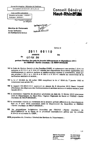 portant fixation des prix de journée hébergement et dépendance 2011 de l'EHPAD "Xavier Jourdain" de NEUF-BRISACH. Resumé Pièces jointes ARRETE Assemblée : Non défini Date : 10/02/2011 Rapporteur : Non défini Collectivité : Conseil départemental du Haut-Rhin Direction : Non défini Service : Direction de l'Autonomie Domaine : Prix de Journée Commission :